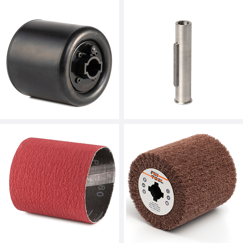 Комбинированное решение для обработки цилиндрических и плоских деталей. Надувной барабан в связке с лентами Sunmight P80 обеспечивает агрессивный съем, а нетканый валик Fix-Tool Coarse формирует финишную матовую структуру без перегрева металла.